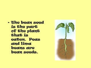 Teachers Notes 2 pages Content Lesson 1 PowerPoint re. The bean seed is covered with a hard outer shell. The ripe fruit opens.